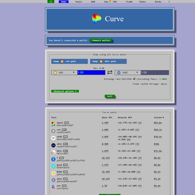 Curve o Curve Finance es un protocolo de liquidez de intercambio descentralizado diseñado para el comercio extremadamente eficiente de stablecoins y Bitcoin sintético en Ethereum.