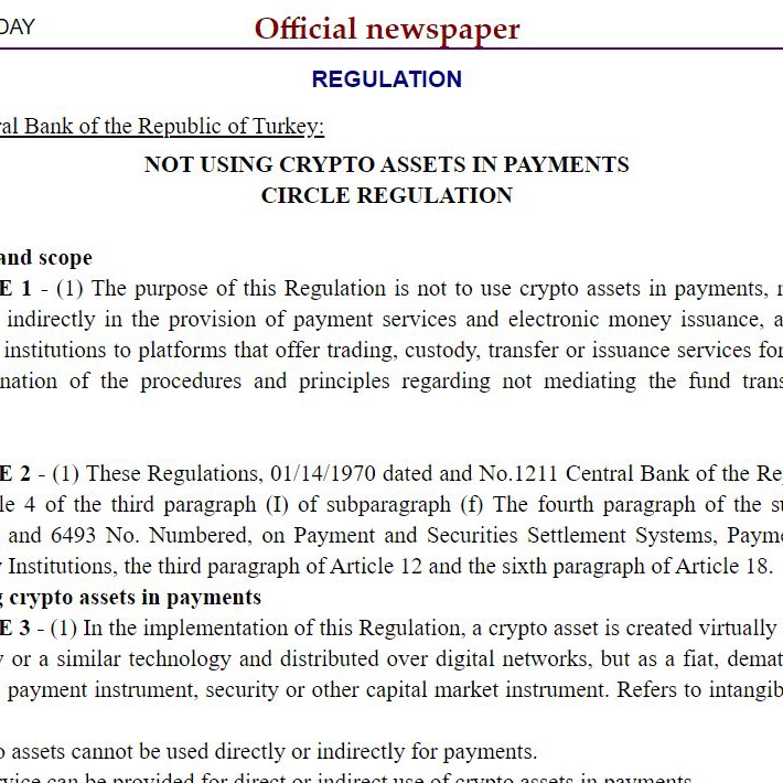En una publicación del Boletín Oficial de esta pasada noche, el Banco Central de Turquía (CBRT) anuncia que las criptodivisas y otros activos digitales de este tipo basados en la tecnología de libro mayor distribuido no podían utilizarse, directa o indirectamente, como instrumento de pago. Esta nueva legislación entra en vigor el 30 de abril.